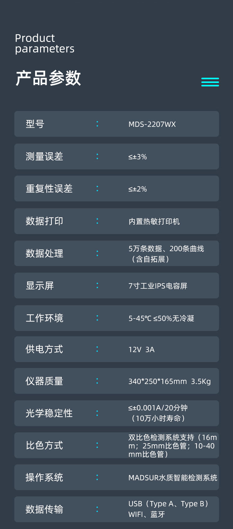 MDS -2207WX 型多參數(shù)水質(zhì)快速測(cè)定儀,基于國(guó)家檢測(cè)標(biāo)準(zhǔn)(GB)及環(huán)境部檢測(cè)標(biāo)準(zhǔn)(HJ)研發(fā)生產(chǎn)。儀器采用工業(yè)級(jí)IPS7寸電容觸摸屏,數(shù)據(jù)直觀,操作方便;檢測(cè)裝置采用進(jìn)口光學(xué)檢測(cè)比色系統(tǒng),并搭載我司自主研發(fā) MADSUR?水質(zhì)智能檢測(cè)系統(tǒng);使得儀器的穩(wěn)定性、壽命、檢測(cè)精準(zhǔn)度跨越性提高;MADSUR?水質(zhì)智能檢測(cè)系統(tǒng)是基于國(guó)人操作習(xí)慣的理念開發(fā)而成,操作簡(jiǎn)單快速;無(wú) 需專業(yè)人員即可輕松操作;真正做到:讓檢測(cè)更簡(jiǎn)單!廣泛應(yīng)用于企業(yè)污水檢測(cè)、環(huán)境監(jiān)測(cè)站、科研單位、高校、河流污染監(jiān)察等水質(zhì)快檢領(lǐng)域。