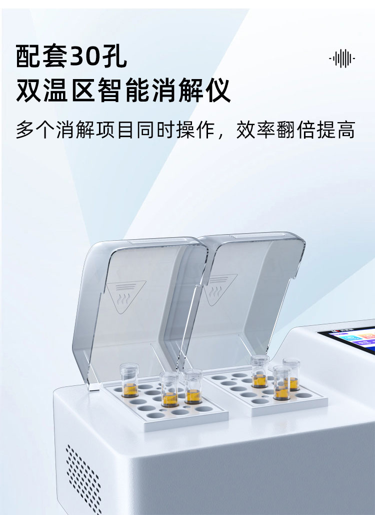 配套30孔雙溫區(qū)智能消解儀,多個(gè)消解項(xiàng)目同時(shí)操作,效率翻倍提高。