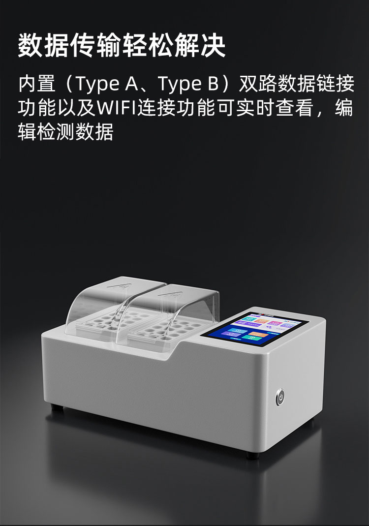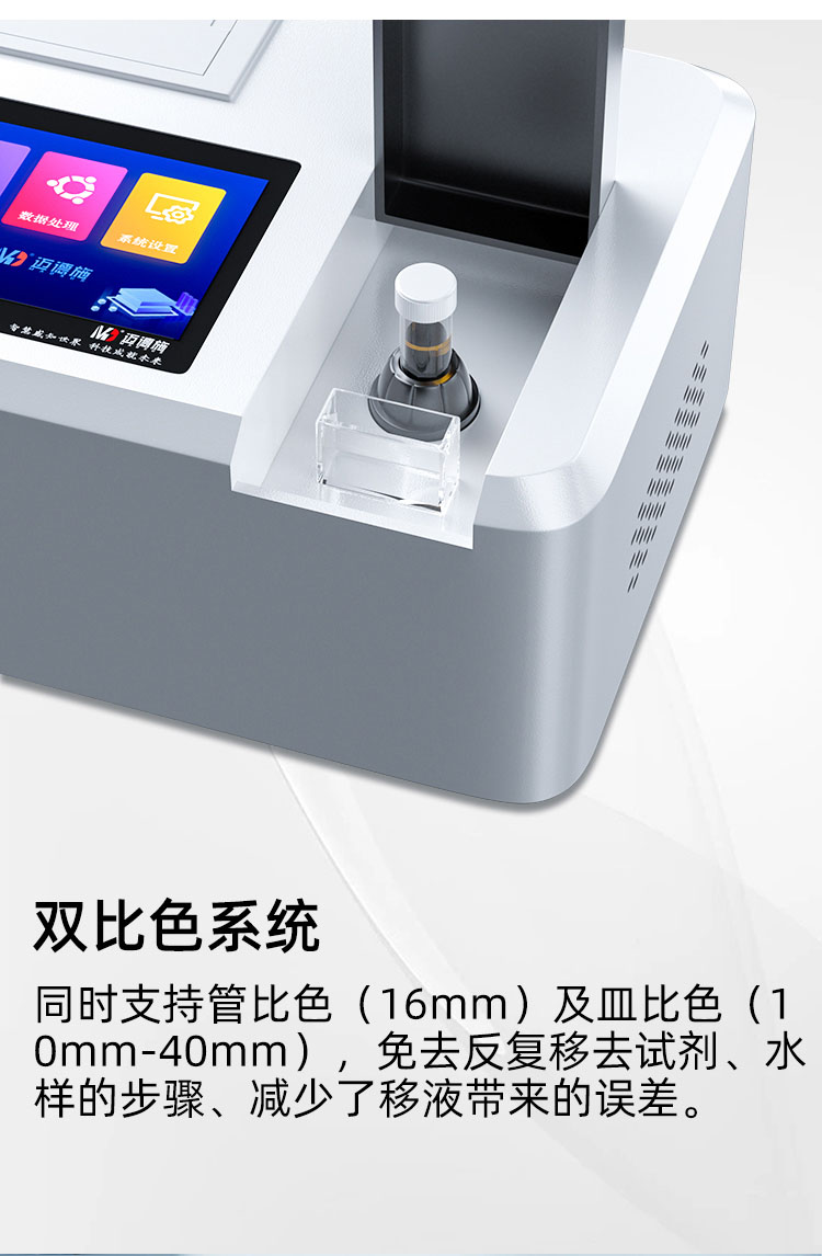 雙比色檢測(cè)系統(tǒng),同時(shí)支持管比色(16mm、25mm)及皿比色(10mm-40mm)。