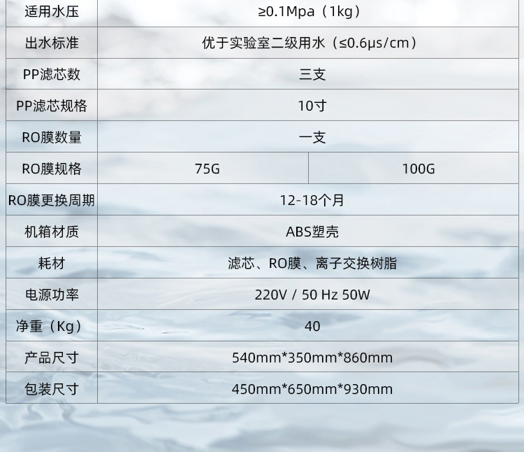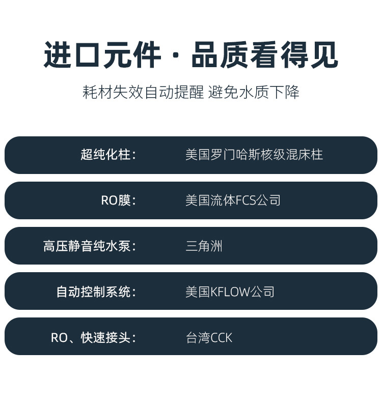 可任意設(shè)定預(yù)處理、RO膜、UV燈和超純水包壽命,顯示耗材使用和剩余時(shí)間;