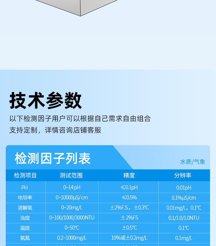 水質(zhì)傳感器可選 COD 在線監(jiān)測(cè)傳感器、氨氮在線監(jiān)測(cè)傳感器、PH 在線監(jiān)測(cè)傳感器、電導(dǎo)率傳感器、溶解氧傳感器、濁度傳感器、流速、液位等水質(zhì)、水文傳感器;